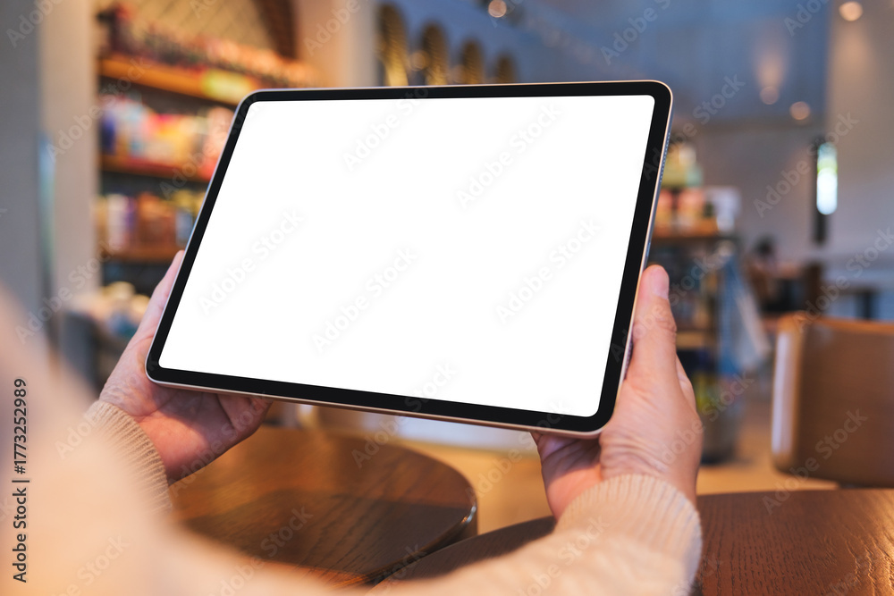 Mockup image of a woman holding digital tablet with blank white desktop screen in cafe