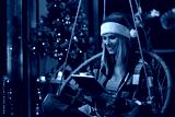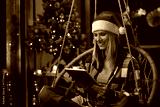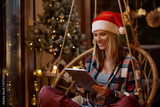 Happy woman surfing the net on touchpad on Christmas Eve at home.