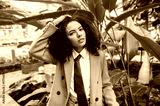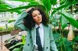 Woman with hands in hair dressed in jacket and tie suit in garden