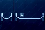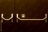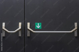 Metal emergency exit door with safety handle system and direction signs for opening.