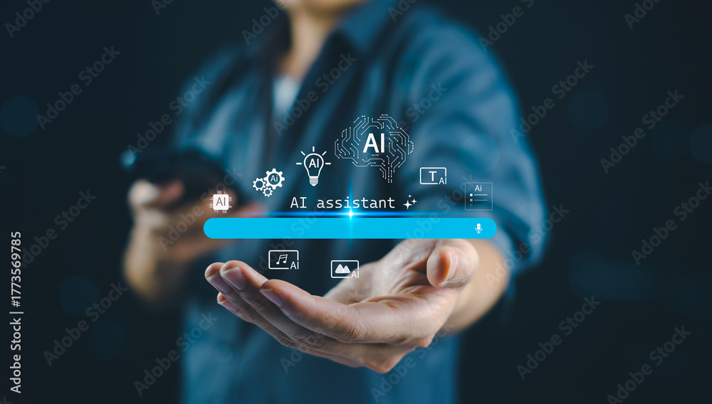 AI assistant voice text image video generate technology with businessman holding smartphone and showing virtual interface for artificial intelligence innovation.