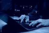 AI search SEO bar search engine data analysis assistant machine learning with hands typing on laptop and virtual interface in digital workspace.
