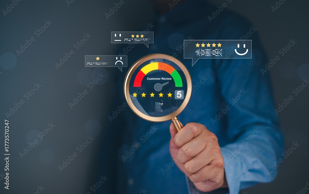 Customer satisfaction feedback rate questionnaire opinion use, businessman holding magnifying glass to analyze customer review data and service performance rating.