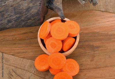 Fresh orange carrots on wooden floor.
