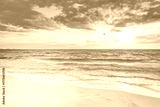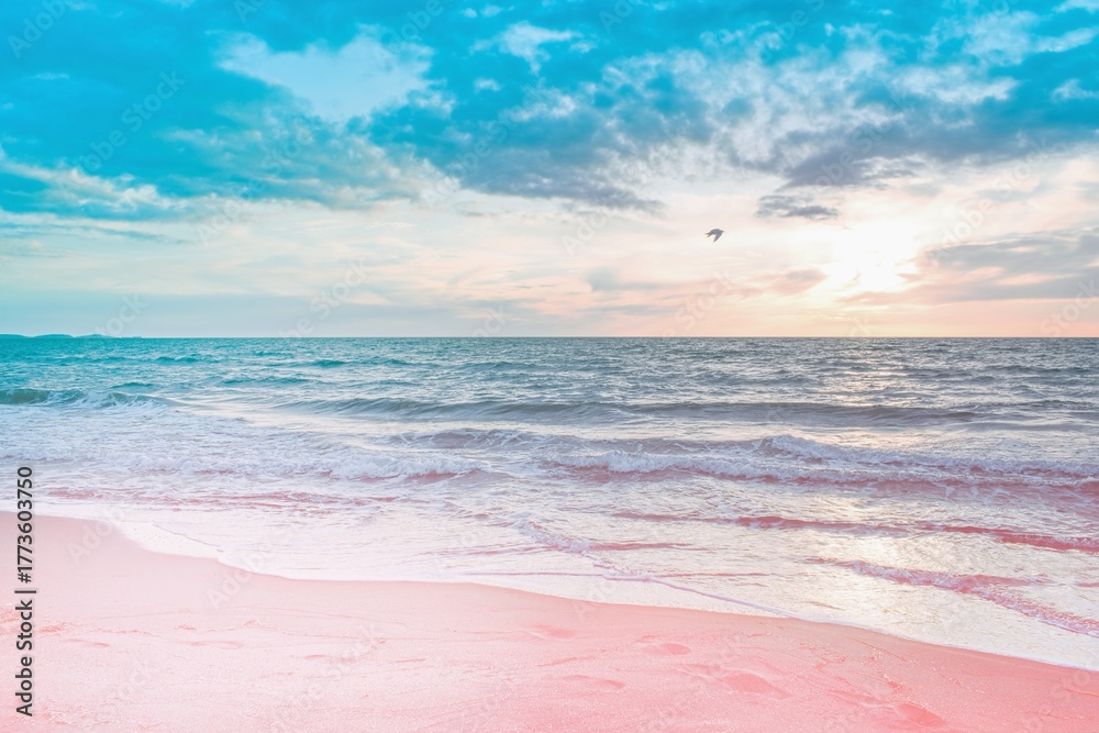 Colorful sunset viewed from the pink sea beach with soft waves