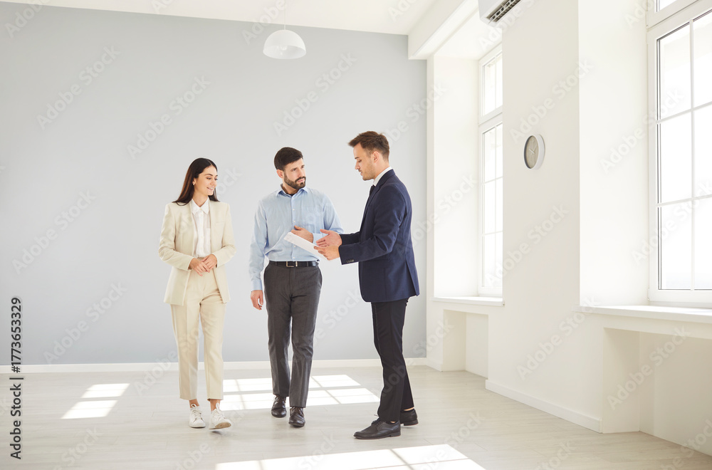 Real estate agent and young family couple discussing mortgage terms and conditions during house tour. Young husband and wife visiting apartment before getting mortgage