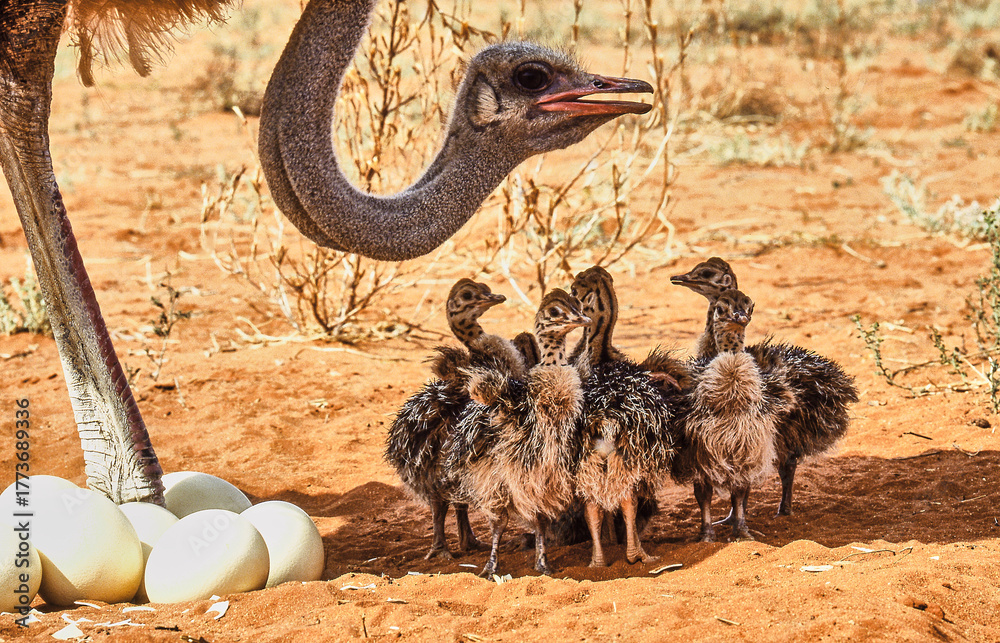 ostrich male, Struthio camelus, watching his chicks, close 296
