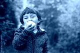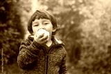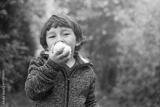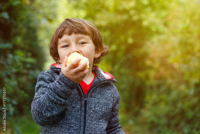 Kleiner Junge Kind Apfel essen Textfreiraum Garten draußen Herbst Natur