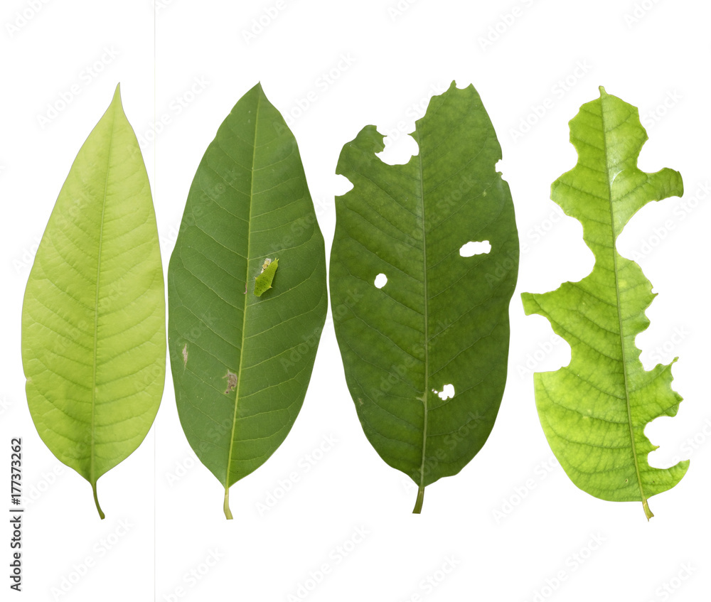 Green leaves are eaten by worms isolated on white background.Leaf with holes