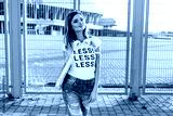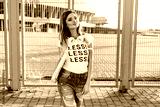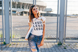 Portrait of a smiling young woman in white T-shirt with word "less" standing with laptop. Image with copy space