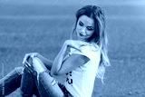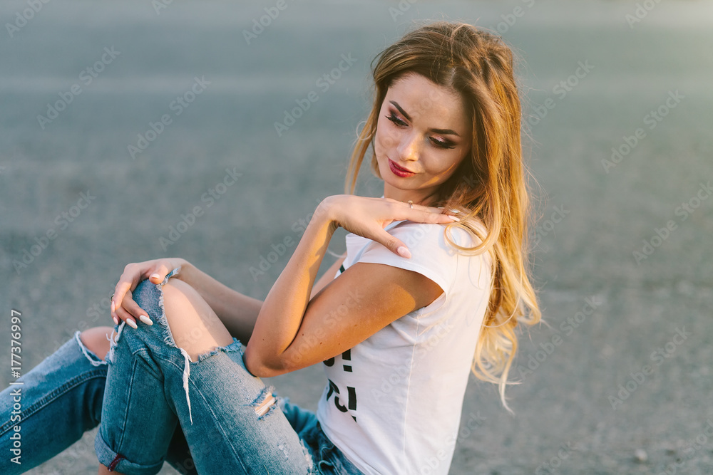 Happy woman in white T-shirt with word "less"sitting on the grass in the park at sunset and enjoy in nature