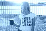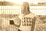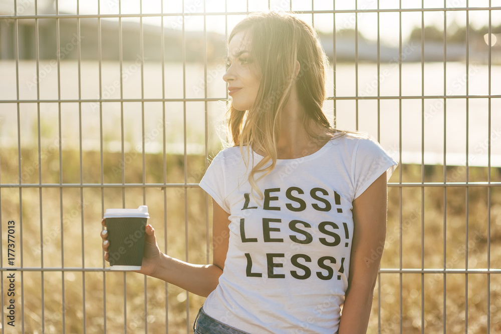 Beautiful woman walking with coffee and shopping bag in white T-shirt with word "less"