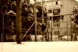 A male tennis player in blue shorts and a black shirt stretches to return a shot on a sunlit outdoor court surrounded by chain-link fencing and greenery, with apartment buildings in the background.