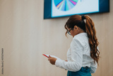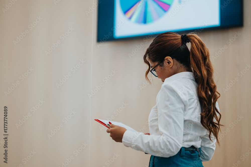 A professional Filipino woman with glasses in a white shirt and blue trousers stands in a modern office, reviewing data on a red tablet while a colorful chart is shown on a screen above.