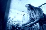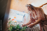 Two young women relax indoors, tending to household plants and enjoying a warm home atmosphere.