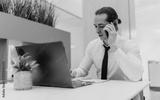 A professional man sits at a clean, bright desk in a modern office, talking on a mobile phone while jotting notes beside a laptop. The scene conveys focus and productivity.