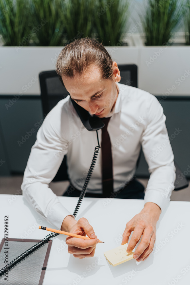 A focused man sits at a white desk, writing on a sticky note while talking on a corded phone. Clean office setting with green plants in the background conveys concentration and routine communication.
