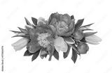Coral peonies and yellow tulip flowers in a floral arrangement isolated on white or transparent background