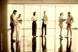 A diverse team of colleagues in smart attire stands in a bright glass-walled lobby, sharing ideas and notes during a casual business discussion.