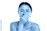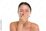 Studio shot of natural woman with dark hair laughing and covering mouth with hand on white background.