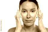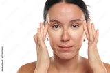 Studio shot of natural woman with dark hair and no makeup applying concealer under eyes with fingers on white background.