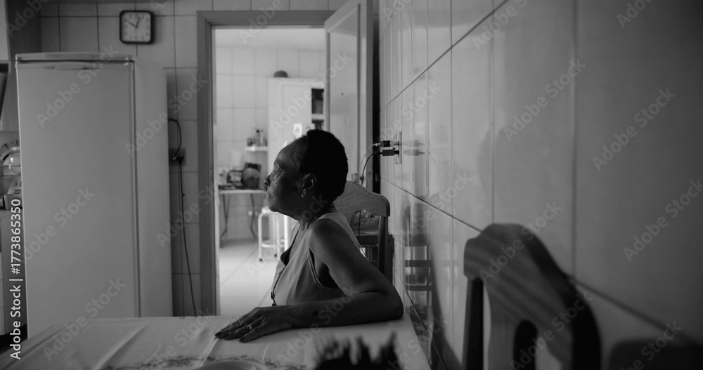 Elderly woman sitting at a dining table in a tiled kitchen, gazing thoughtfully towards the light, in a serene and reflective moment, black and white. Solitude in old age