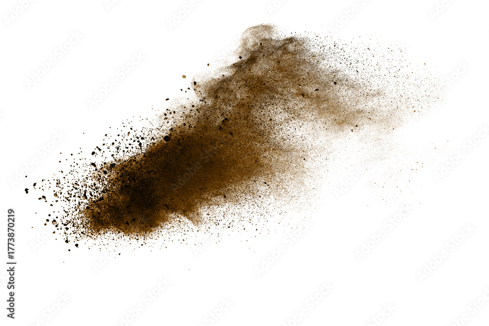 Brown coffee color powder explosion isolated on white background. Colored brown. Colorful dust explode. Paint Holi