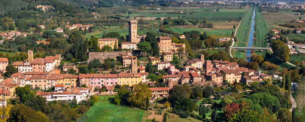 Italy tourism. Vicopisano medieval town in Tuscany, near the art cities of Pisa, Lucca and Florence, perfect base for exploring Tuscan region. aerial drome panoramic view