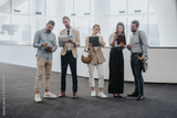 Group of colleagues and friends stands in a bright, modern corridor, examining tablets and papers. They appear focused and collaborative, illustrating teamwork, planning, and professional networking.