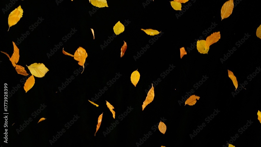 Falling colorful autumn leaves isolated on black background