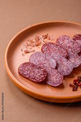 Smoked salami slices, beef or chicken sausage for sandwiches. Salami slices