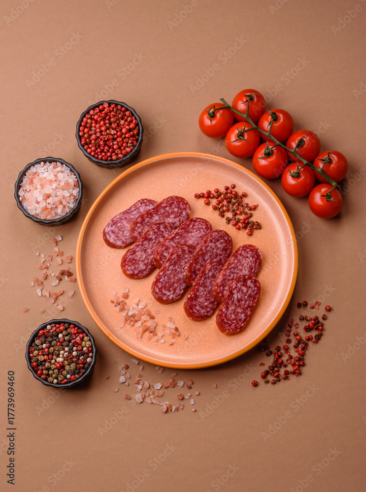 Smoked salami slices, beef or chicken sausage for sandwiches. Salami slices