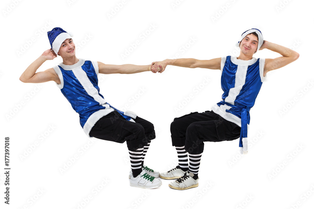 two Christmas men in blue santa clothes dancing against isolated white in full length.