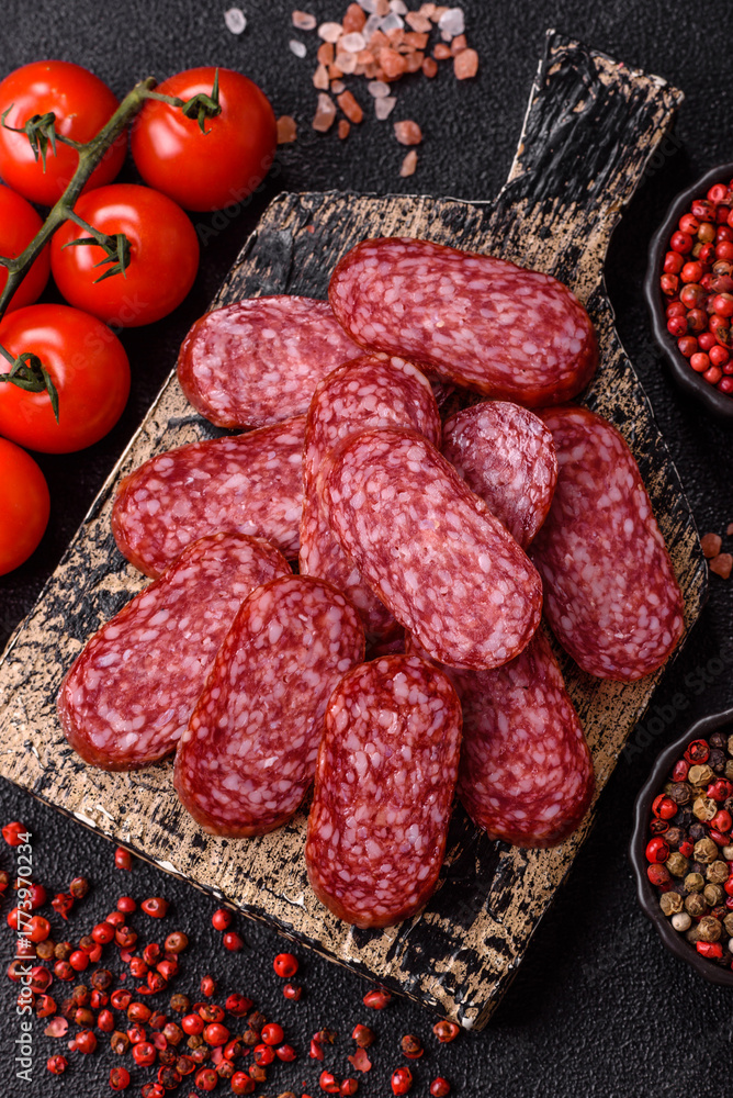 Smoked salami slices, beef or chicken sausage for sandwiches. Salami slices