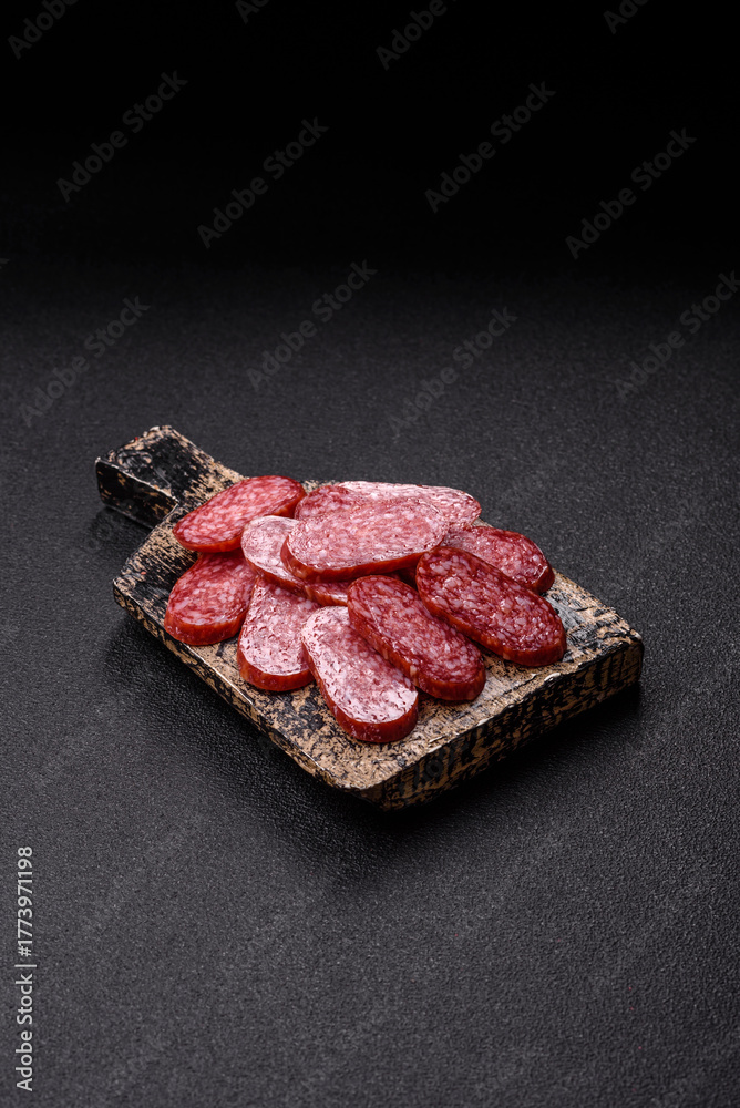 Smoked salami slices, beef or chicken sausage for sandwiches. Salami slices