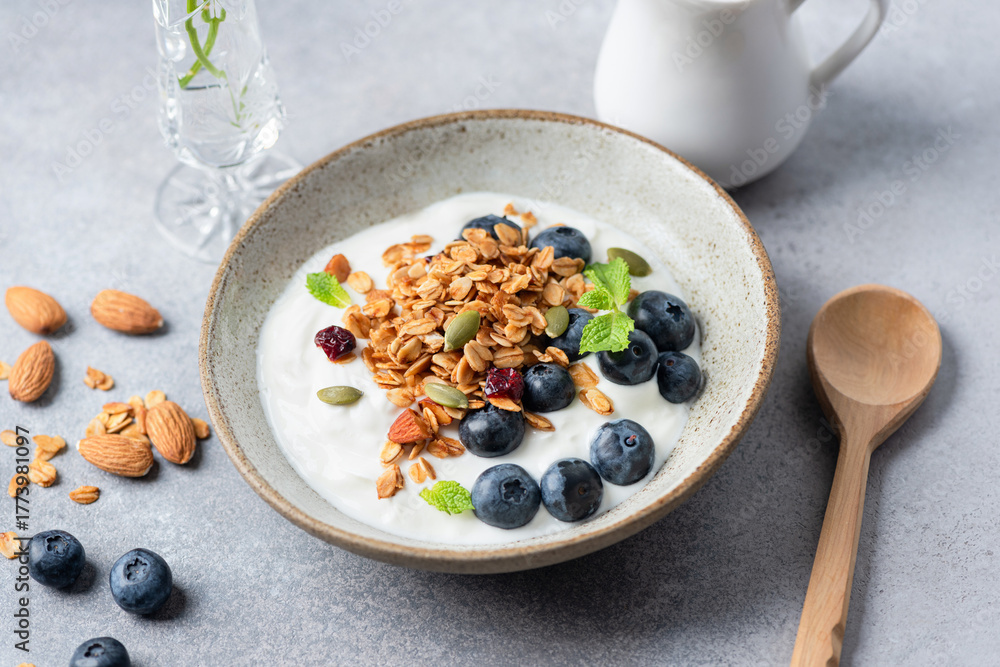 Bowl of yogurt with homemade granola and blueberries on a wooden table background, clean eating diet