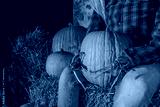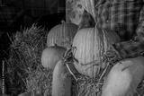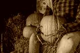 Scarecrow sitting on hay bale with pumpkins for halloween