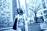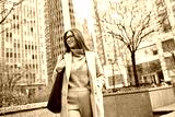 Smiling business lady walking outdoors looking away enjoying fall time in downtown. Young happy elegant brunette woman wearing coat and glasses standing on big city street.