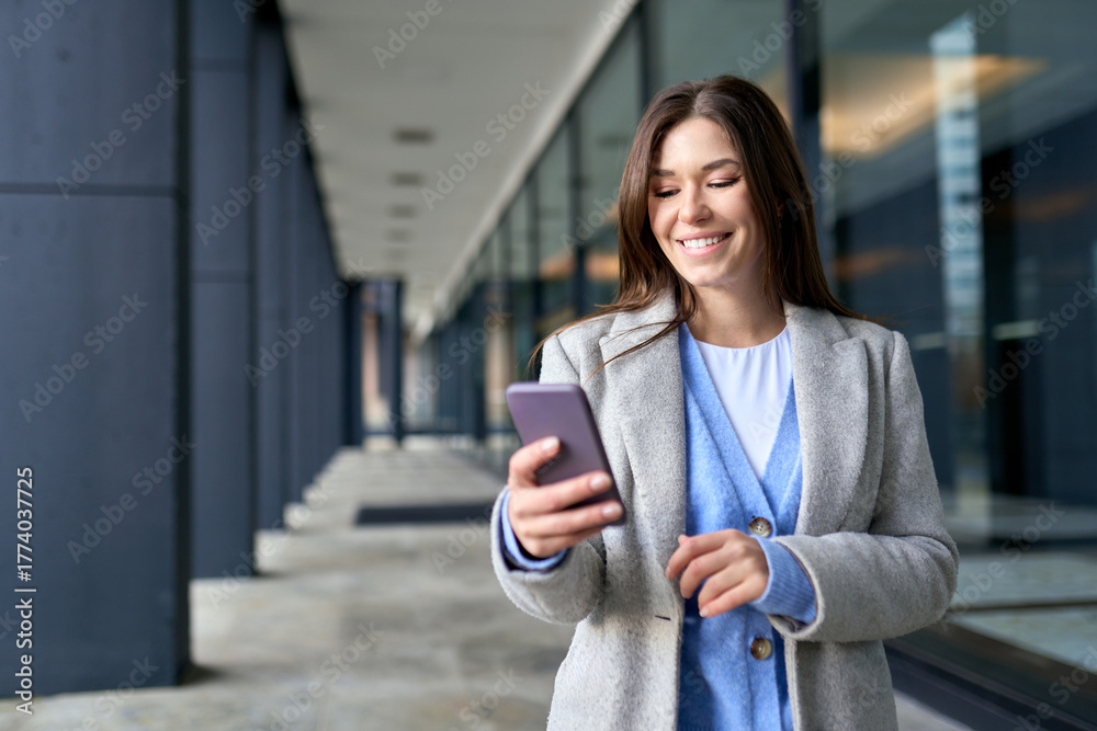 Young smiling happy woman, busy business lady standing outside office building on city street holding smartphone device using mobile cell phone technology, texting on cellphone.