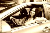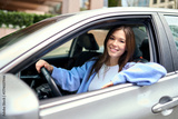 Portrait of young happy woman customer driver sitting inside car looking at camera. Driving school and car leasing concept. Buying new car, vehicle trade and travel car hire.