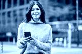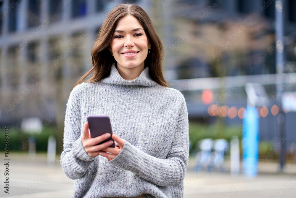 Young smiling happy woman, business lady standing outdoors on big city street holding smartphone in hands using mobile cell phone technology, typing on cellphone, looking at camera. Portrait