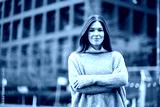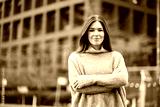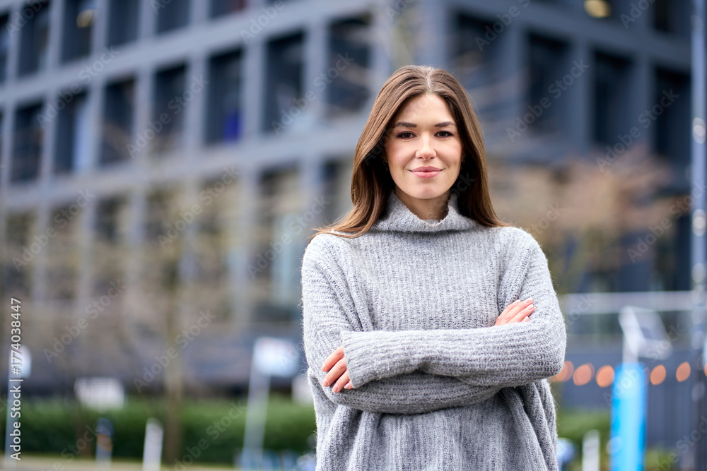 Young smiling professional business woman, happy confident 30s lady student standing outdoors on big city street business district, looking at camera, crossing arms, portrait.