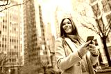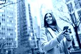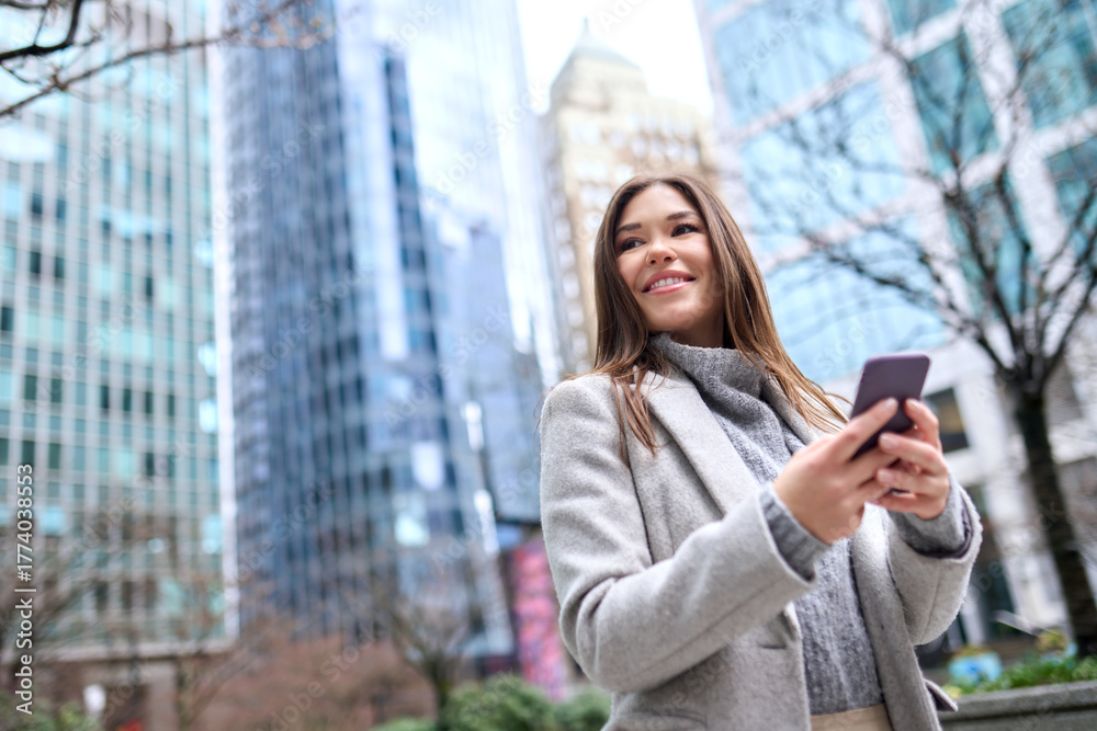 Young smiling happy woman, business lady standing outdoors on city street holding smartphone using financial banking apps for payments on mobile cell phone technology texting on cellphone.