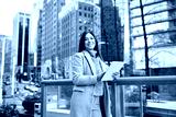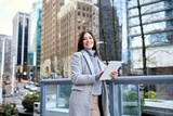 Young happy business woman professional or female student standing on big city street using digital tablet fintech pad device technology looking at camera thinking of financial success.