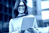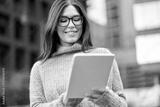 Young happy busy business woman professional leader or female student wearing grey sweater and glasses standing on big city street using digital tablet fintech pad device technology looking at pad.