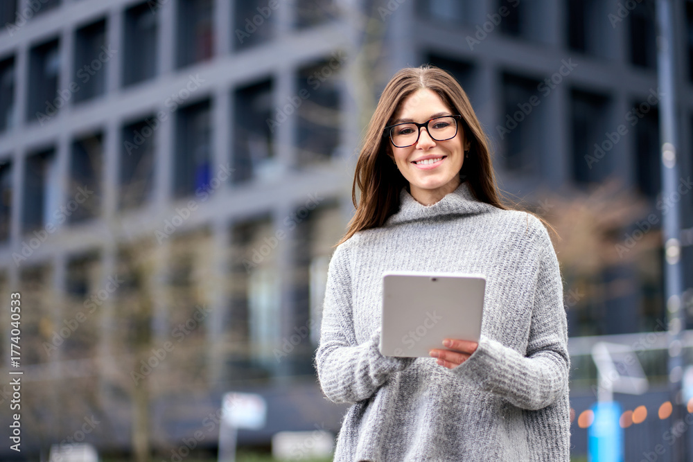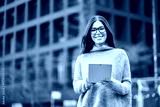 Young happy business woman professional leader or female student standing on big city street holding digital tablet fintech pad device technology looking at camera thinking of future career. Portrait