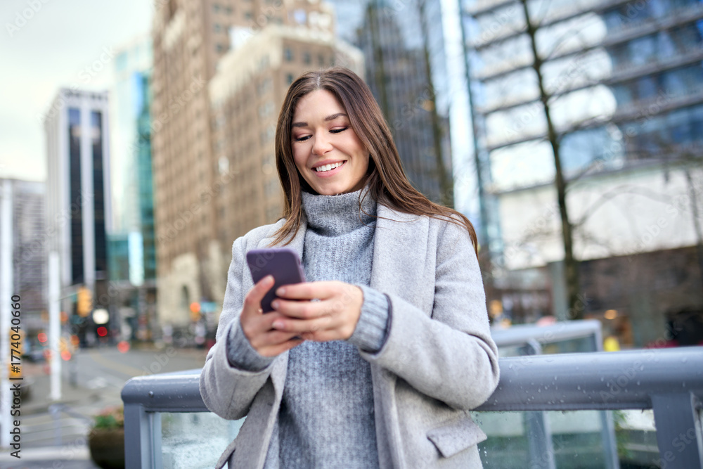 Young smiling happy woman, business lady standing outdoors on big city street wearing coat holding smartphone in hands using mobile cell phone technology, typing on cellphone, candid photo.