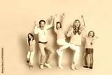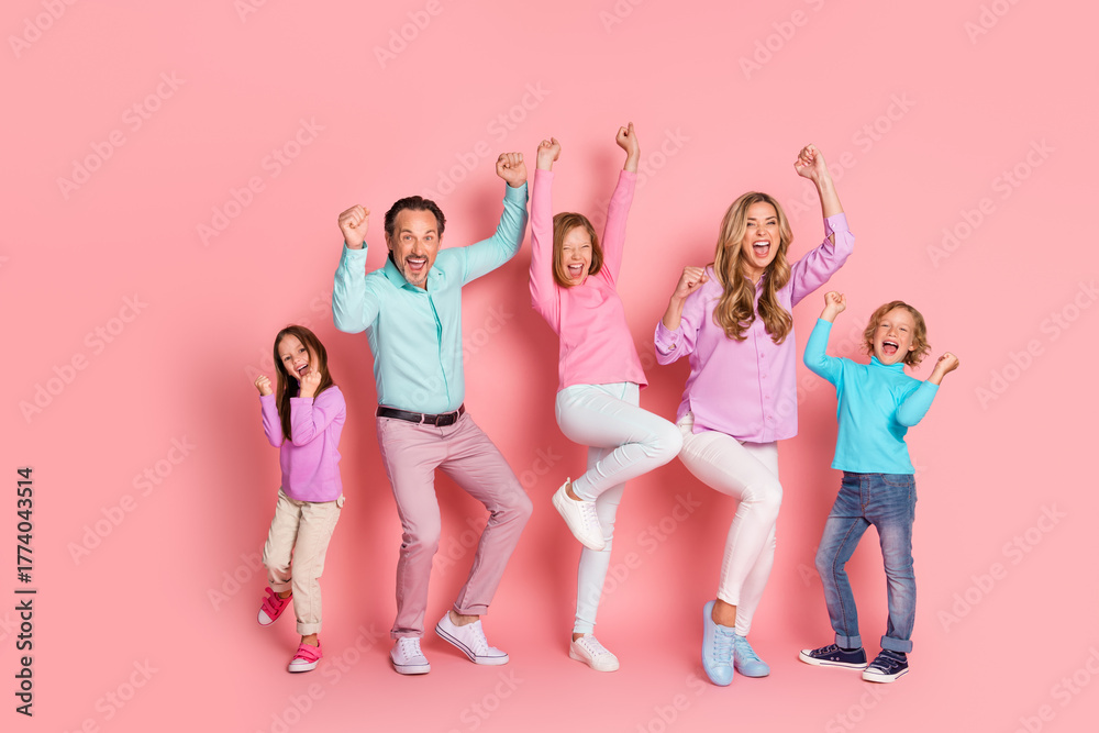 Family celebration in a pink studio with parents and kids jumping and smiling together in bright pastel outfits