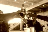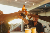 Close-up of a group of Latino friends clinking beer bottles in a cheerful toast during golden hour at a bar or restaurant.