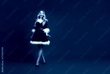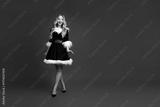 Elegant christmas fashion girl in green velvet dress with white fur trim standing on a bold red background for holiday season and festive shopping themes